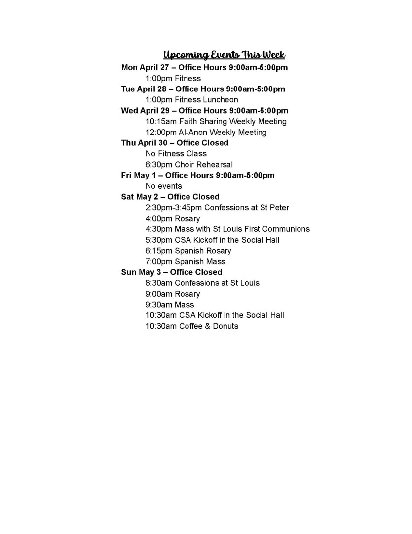 NOTE: Because there will not be a 9:30am Mass on Sun Apr 19, the 4:30pm Mass on Sat Apr 18 will be livestreamed.